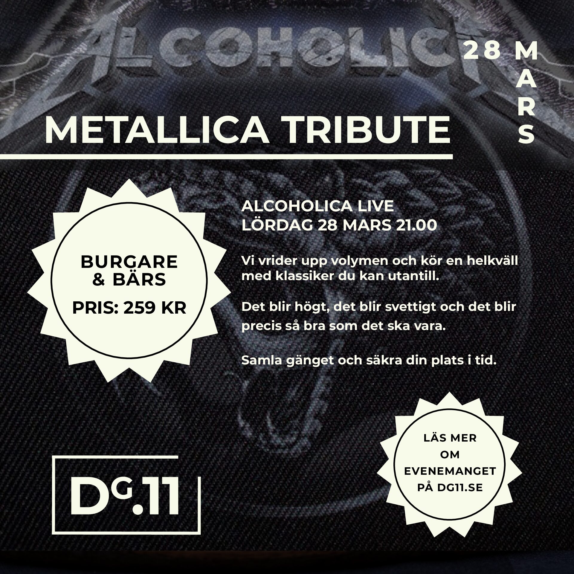 Den 28 mars förvandlas DG11 till en riktig rockbar. På scen står ett rutinerat tribute-band som levererar Metallicas största låtar med rätt tryck, rätt känsla och utan krångel. Det blir riffen du väntar på, refrängerna du skriker med i och tempot som håller dig kvar hela kvällen.
